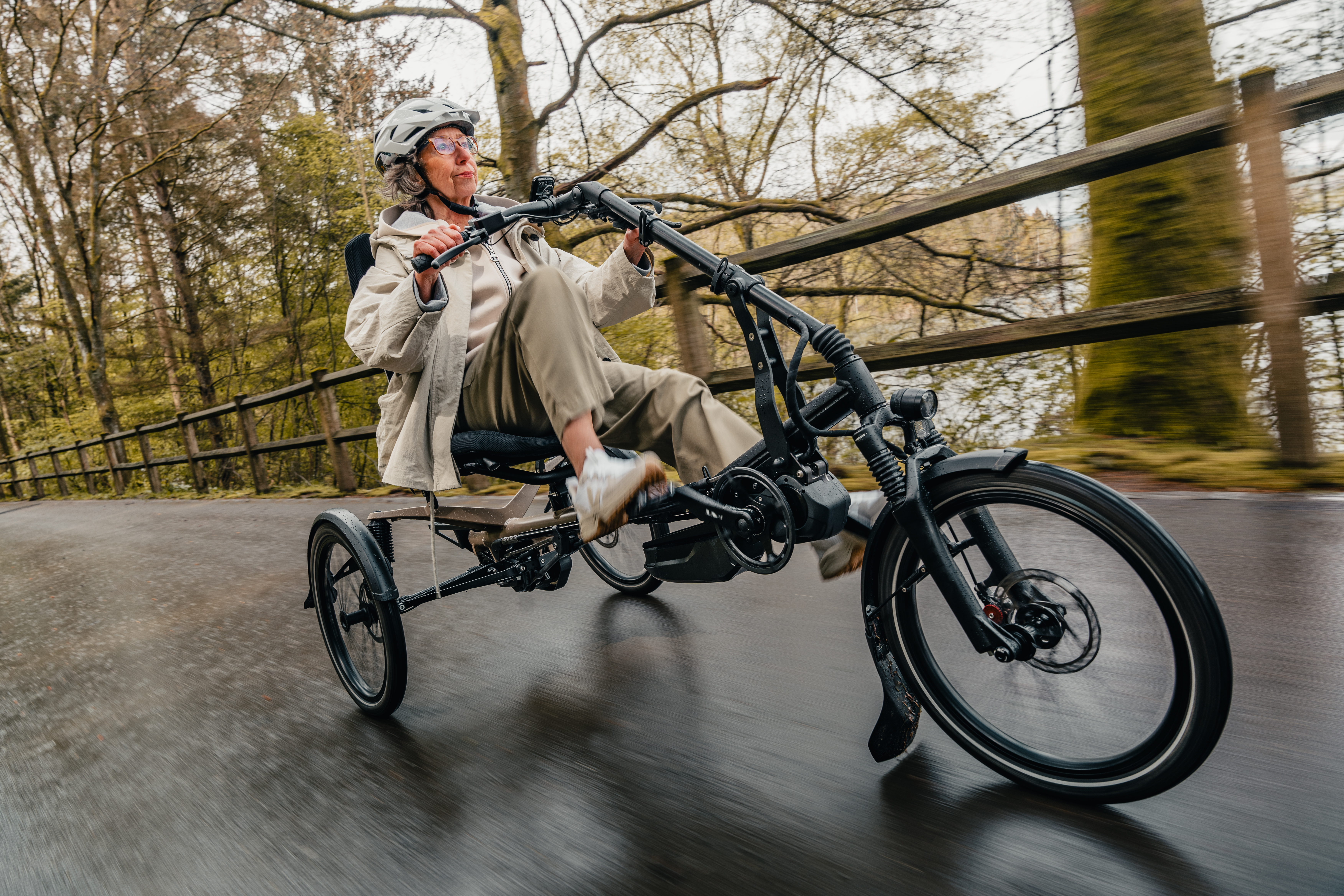 Kettwiesel ONE Reha avec numéro d'aide - Bras inférieurs – Vert pâle satiné RAL 6021 - Suspension intégrale - Hauteur d'assise réglable 52 ou 60 cm - Moteur électrique Pedelec Bosch Performance Line CX (Assistance maximale jusqu'à 12 km/h) - Batterie 545 Wh - Fourche à suspension Spinner 300 – Shimano Inter 5E Di2 - Différentiel - Housse de siège Vario Komfort – rallonges de siège incluses - 2 coussins triangulaires pour housse de siège Vario Komfort - Cadre en aluminium - Freins couplés, le levier droit freine hydrauliquement les roues arrière, le levier gauche freine mécaniquement la roue avant - Garde-boue SKS noir mat – Manivelles réglables 65-165 mm 39T - Éclairage via la batterie du moteur : phare - B+M IQ-X / + B&M Toplight 2C plus - Pneus Schwalbe Marathon – Ceinture abdominale – Fanion - Pédales avec sangles au talon